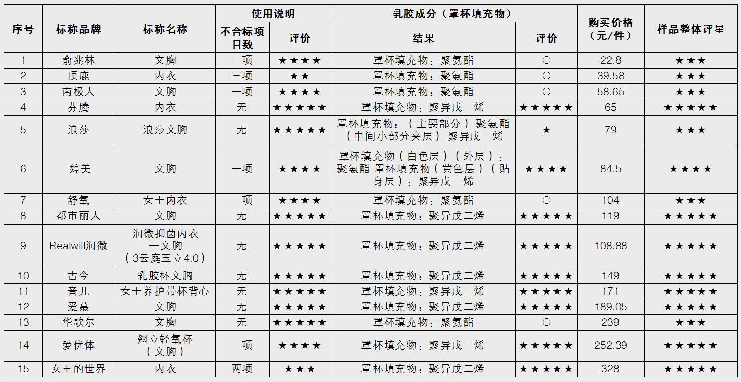 15款乳膠內衣樣品情況及比較試驗結果概覽