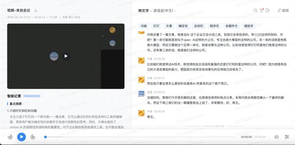 通義聽悟可自動為音視頻生成全文摘要、章節概括、發言總結