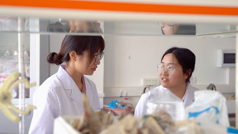 ▲ 王海丹(右)與同事在實驗室探討包材問題。孟云歸▕攝