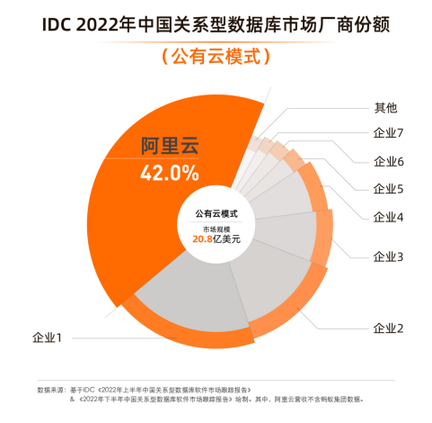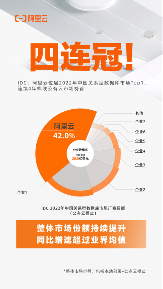日前,全球領(lǐng)先的IT市場研究和咨詢公司IDC發(fā)布《2022年下半年中國關(guān)系型數(shù)據(jù)庫軟件市場跟蹤報(bào)告》,報(bào)告顯示,2022全年阿里云市場份額(公有云+本地部署模式)位居第一,其中公有云模式市場份額高達(dá)42%,以絕對(duì)優(yōu)勢(shì)連續(xù)4年蟬聯(lián)榜首。