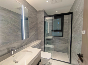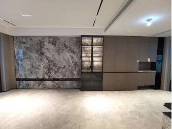 衛(wèi)生間都用了大面積巖板鋪裝,連紋巖板顏值高。此外,客廳背景墻、展示柜背景板、入戶玄關(guān)柜臺面、廚房島臺側(cè)面,都用了雪山銀狐花紋的巖板裝飾,色調(diào)優(yōu)雅。