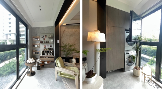 陽臺也是細節(jié)滿滿:一側(cè)墻面向內(nèi)凹陷,打造了家政柜,預(yù)留了洗衣機、烘干機使用空間,方便后期上下水。值得一提的是,家政柜是無底柜設(shè)計,為玄關(guān)下方儲物騰出空間,可以放置掃地機器人。