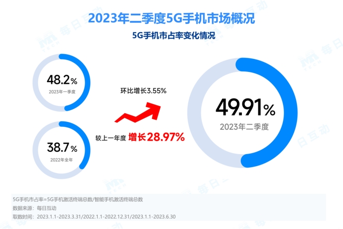 2023年二季度,手機(jī)市場(chǎng)傳統(tǒng)出貨旺季疊加618年中大促節(jié)點(diǎn),國(guó)內(nèi)智能手機(jī)市場(chǎng)風(fēng)云又起。各大廠商不僅加快上新頻率,以蘋果為代表的高端機(jī)型也開始通過價(jià)格策略進(jìn)一步搶占市場(chǎng)份額。中國(guó)信通院數(shù)據(jù)顯示,2023年1-5月,國(guó)內(nèi)5G手機(jī)出貨量為8496.7萬(wàn)部,占同期手機(jī)出貨量的79.0%。數(shù)據(jù)智能上市企業(yè)每日互動(dòng)(股票代碼:300766)通過分析5G智能手機(jī)激活設(shè)備數(shù),持續(xù)觀察5G手機(jī)市場(chǎng)。每日互動(dòng)大數(shù)據(jù)顯示,截至二季度,國(guó)內(nèi)5G手機(jī)市占率逼近50%,5G手機(jī)市場(chǎng)增長(zhǎng)穩(wěn)定。