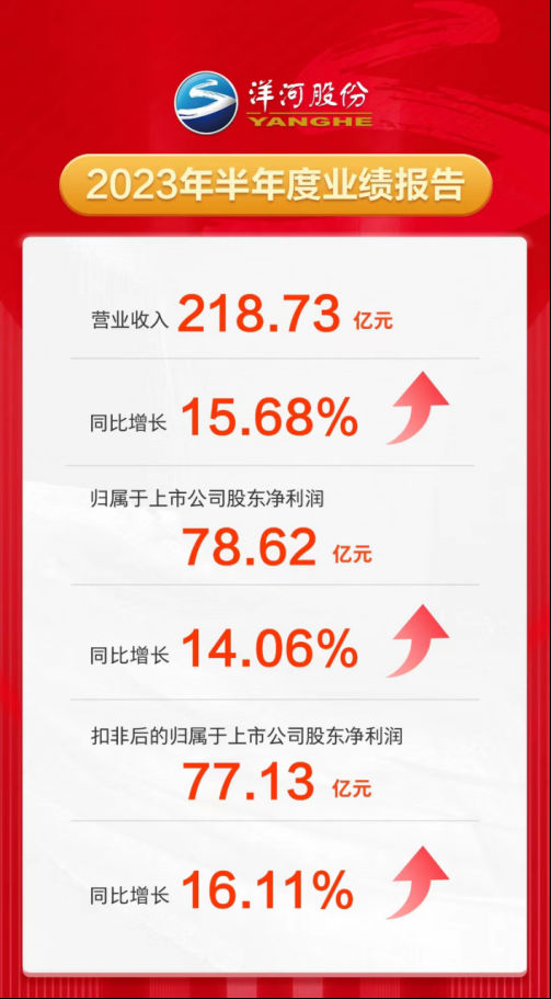 8月28日晚,洋河股份公布2023年半年度報告,上半年營業收入218.73億元,同比增長15.68%;實現歸屬于上市公司股東的凈利潤78.62億元,同比增長14.06%。