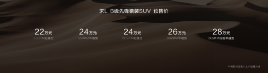 宋L以先鋒詮釋感官體驗,以科技書寫豪華新篇,以時尚彰顯獨特個性,致力成為B級SUV市場先鋒,為主流家庭用戶帶來多元化、個性化、智能化的用車新體驗。
