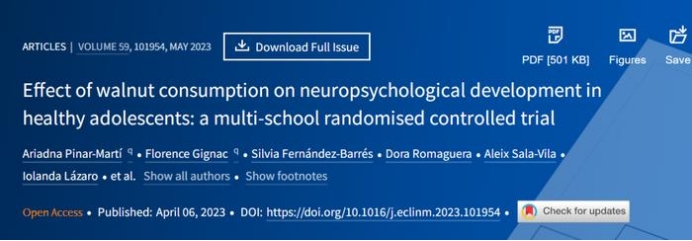 這一研究成果是來自西班牙 IISPV 研究所、龐培法布拉大學(xué)等單位的研究人員的《Effect of walnut consumption on neuropsychological development in healthy adolescents: a multi-school randomised controlled trial》的論文,并于今年4月份在世界頂級期刊《柳葉刀》子刊e Clinical Medicine 上發(fā)表了該研究。