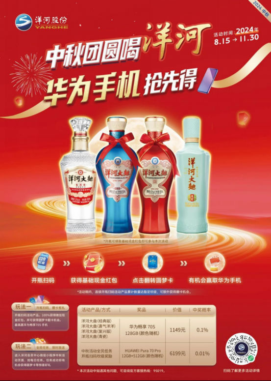 中秋團圓喝洋河,萬部華為搶先得。2024年8月15日—11月30日,活動期間購買洋河產品,開瓶掃碼搶萬部華為手機,更有多重好禮等你來拿!