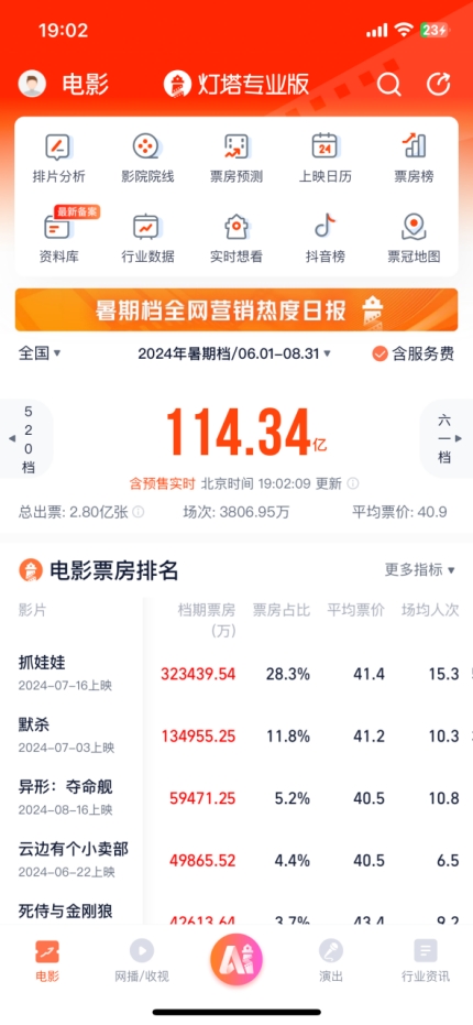 燈塔專業版數據顯示,截至8月29日,今年的暑期檔票房總數達到114.33億元,總出票數2.8億張,場次3806.6萬場,平均票價40.9元。