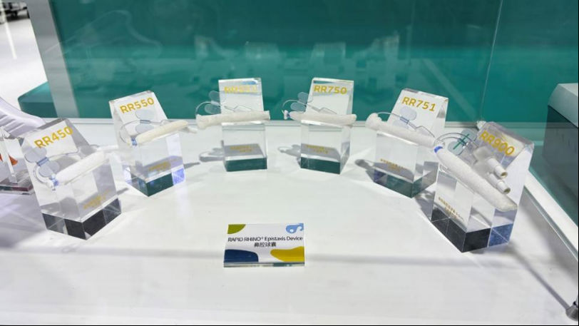 在本屆進博會上,施樂輝帶來了專為控制鼻出血設計的RAPID RHINO Epistaxis Device鼻腔球囊。作為本次進博會的首展新品,RAPID RHINO Epistaxis Device鼻腔球囊采用球囊設計結合遇水可形成凝膠狀物質的CMC(羧甲基纖維素)織物。CMC科技為鼻腔填塞提供了一個濕潤的環境,易于鼻腔填塞物的置入及取出,同時,它的可充氣球囊設計也能幫助醫生在填塞過程中精確控制壓迫力度,再結合多個尺寸型號可供選擇,滿足不同患者的止血需求。