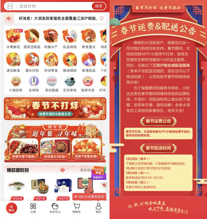 春節期間,大潤發優鮮APP推出“買年貨到大潤發,省心省力送到家”,在為顧客準備豐富的年節禮盒和年貨商品的同時,更有下單實付88元返30元券包的優惠活動,為顧客節省每一分錢。王娟