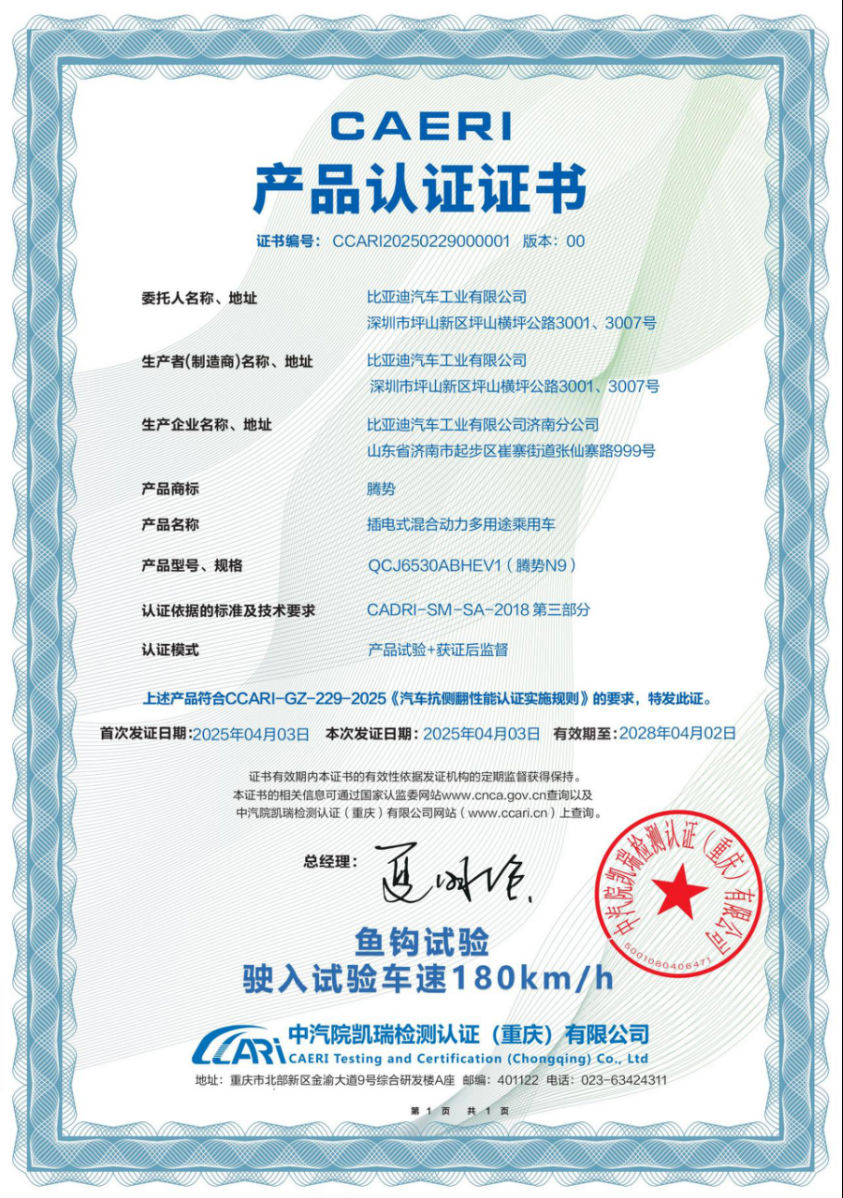 4月16日,騰勢N9通過權威機構中國汽研測試認證,以180km/h的速度再次刷新全球魚鉤測試紀錄。騰勢N9也成為國內首款獲得權威機構魚鉤測試認證的車型。之前,在騰勢N9發布會上官方公布的魚鉤測試成績是160km/h,在安全的宣傳上,比亞迪很務實、很保守,魚鉤測試能做到180km/h的速度,卻只宣傳160km/h。