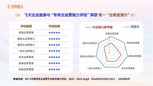 近日,國際數據公司IDC發布《中國專有云運營平臺技術能力評估,2025》,阿里云是唯一在七個維度全部獲得滿分的廠商,體現了飛天企業版全面領先的技術實力與產品先進性。