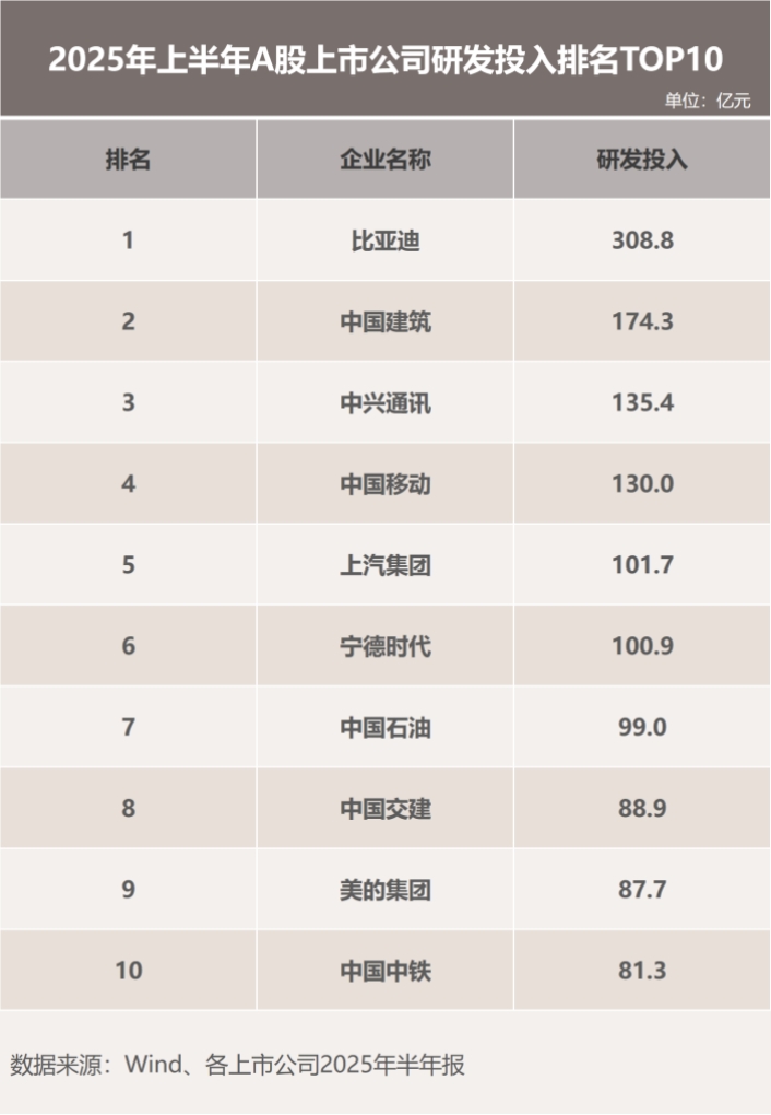 據中國上市公司協會數據,今年上半年,全市場上市公司研發投入同比增長3.27%。而比亞迪研發投入達309億元,同比增長53%,比同期凈利潤高一倍,成為A股上半年“研發之王”。