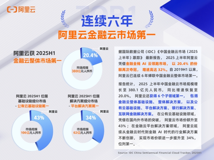 近日,據國際數據公司(IDC)《中國金融云市場(2025上半年)跟蹤》最新報告,2025上半年阿里云憑借金融全棧AI云領跑市場,以20.4%的份額再次奪冠,增速高達32%。自2019H1以來,阿里云已連續6年蟬聯中國金融云整體市場第一。