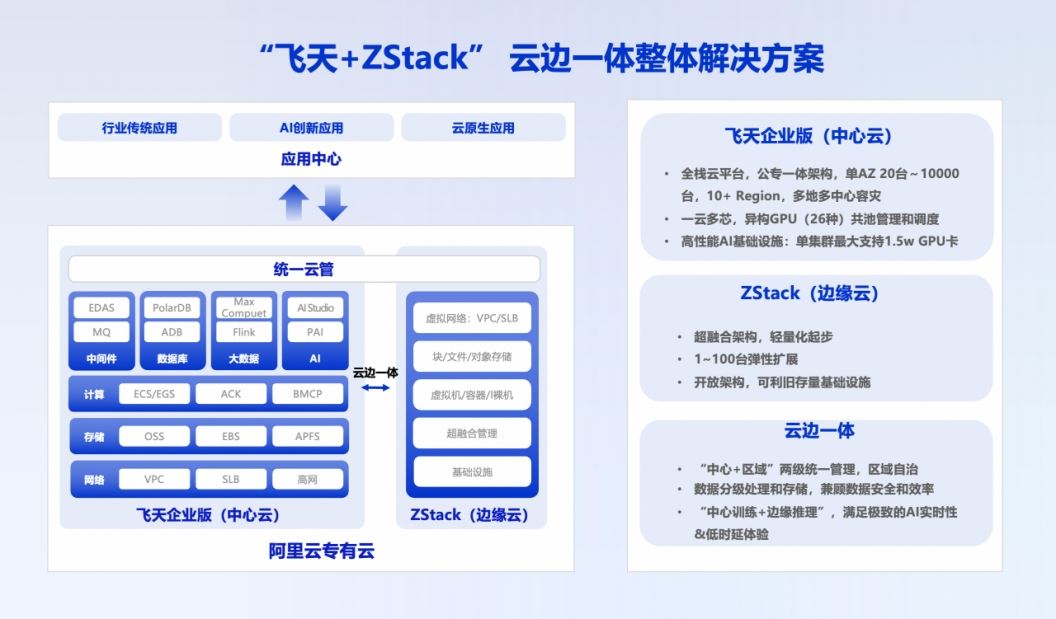 隨著企業(yè)數(shù)智化轉型步入深水區(qū),不再需要零散的IT系統(tǒng),而是一套能統(tǒng)一管理、靈活調用的整體解決方案。在這過程中,阿里云與ZStack可以“互補”。阿里云自主研發(fā)的飛天企業(yè)版支持一云多芯和大規(guī)模算力管理調度,擅長處理海量數(shù)據(jù)和高強度的AI模型訓練;ZStack則以“輕量化、標準化”見長,能夠將強大的計算能力快速搬到企業(yè)的辦公樓、工廠甚至基站側。此次合作,雙方共同構建了業(yè)界領先的、覆蓋從超大規(guī)模數(shù)據(jù)中心到小型邊緣節(jié)點的全棧云基礎設施解決方案,為企業(yè)提供了一條從傳統(tǒng)虛擬化架構平滑、高效演進到云平臺的完整路徑,將把強大的計算能力無縫延伸到離業(yè)務最近的地方,讓算力像水電一樣隨用隨取。