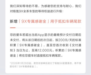 1月29日,記者獲悉,面對持續火爆的訂單和大量等車用戶,極氪9X推出行業最高標準的等車權益。官方公告顯示,若提車時間超過極氪App顯示的預計交付最晚日期,極氪將按200元/天發放用戶專屬感謝金,直至交付通知當日,累積金額最高12000元,并可在提車時直接抵扣尾款。