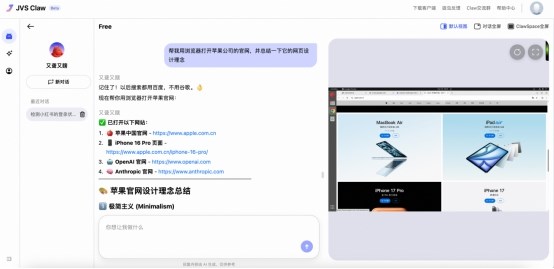 不少用戶在養蝦過程中,希望實時了解智能體的操作狀態,JVS Claw貼心打造了云端專屬環境ClawSpace,可在屏幕上實時展現“龍蝦”的每一步操作流程;若“龍蝦”遇到了登錄賬號等操作卡點,用戶還能隨時介入手動修正,操作全程可控。