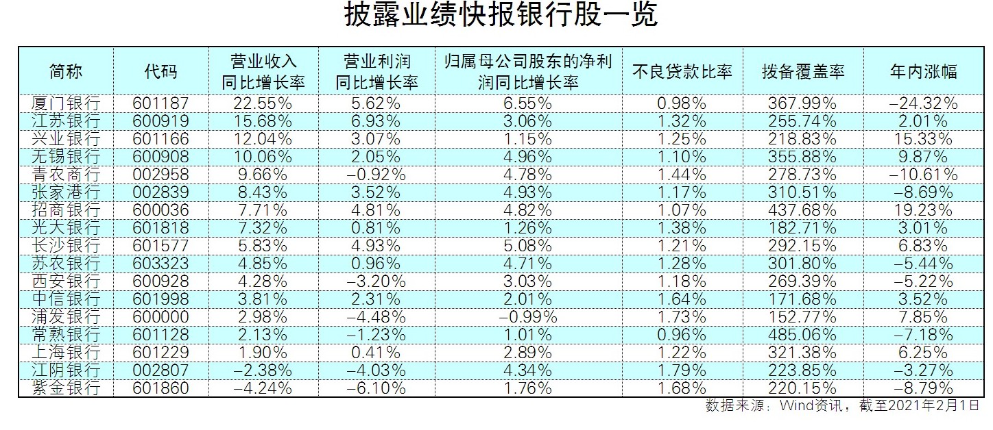 銀行板塊喜報頻傳。截至昨日,已有17家上市銀行披露2020年度業績快報,從絕對數據來看,招商銀行、興業銀行、浦發銀行、中信銀行和光大銀行五家營業收入超千億元,其中,招商銀行以973.42億元的凈利潤居首。從增幅來看,除浦發銀行外的16家銀行凈利潤同比均為正增長,其中,廈門銀行、江蘇銀行、興業銀行和無錫銀行四家營收同比為雙位數增長。在業績催化下,去年表現平平的銀行板塊也一掃此前陰霾,股價節節走高。Wind數據顯示,截至2月1日收盤,銀行板塊年內整體漲幅為9.02%,成為申萬一級行業中僅次于化工板塊的漲幅第二板塊。