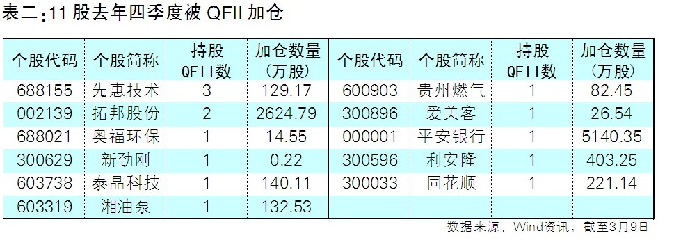 從進駐的QFII數量來看,先惠技術被華泰金融控股(香港)有限公司、法商法國興業銀行股份有限公司、摩根大通銀行3家QFII新進買入,合計新進129.17萬股,此外拓邦股份也有2家QFII進駐。