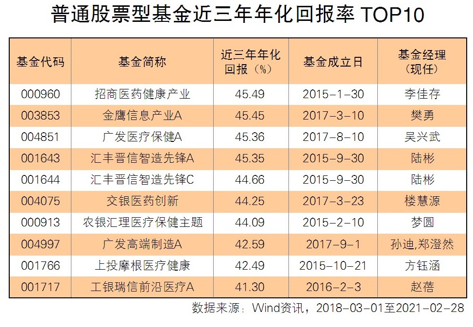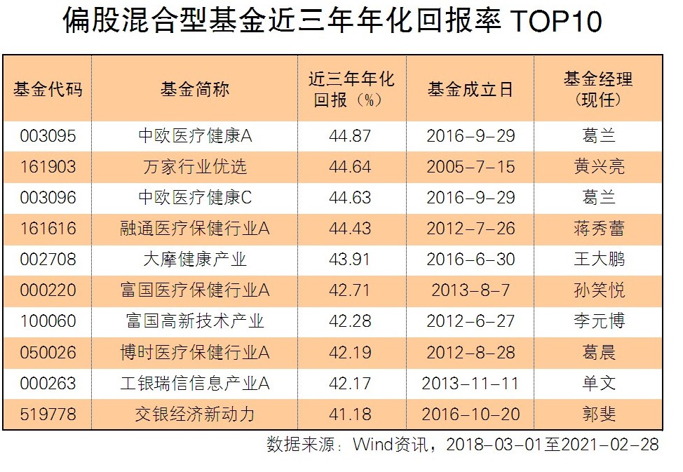 偏股混合型基金的整體回報率較普通股票型基金略低,近三年年化回報率平均為21.45%。成立滿三年的602只偏股混合型基金中,排名第一的是中歐醫療健康A,基金經理葛蘭從2016年9月基金成立時一直管理至今,近三年年化回報率為44.87%,領先于最后一名55.74個百分點。排名第四的融通醫療保健行業A、排名第五的大摩健康產業、排名第六的富國醫療保健行業A、排名第八的博時醫療保健行業A,也均是醫藥類基金,近三年年化回報率均超過42%。