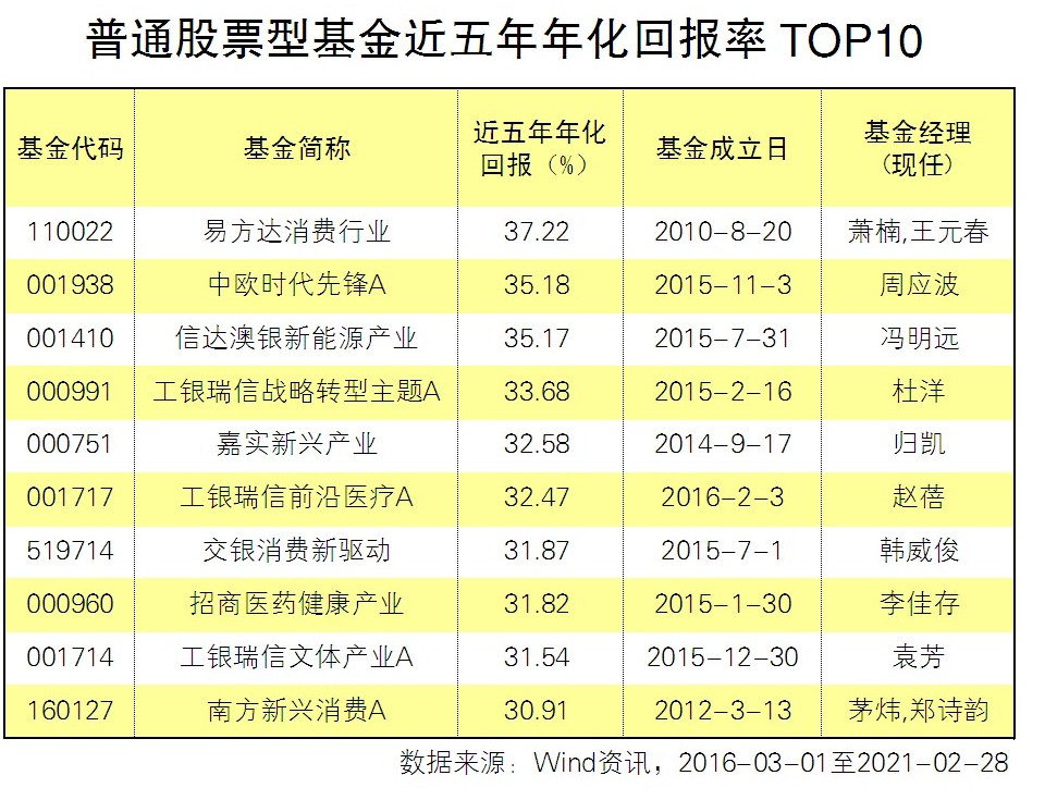 Wind數據統計顯示,2016年3月至2021年2月,成立滿五年的160只普通股票型基金近五年年化回報率平均為20.47%(A/C分開計算)。排名第一是易方達消費行業,基金經理肖楠從2012年9月開始管理,近五年年化回報率為37.22%,排名第二的是周應波管理的中歐時代先鋒,排名第三的是馮明遠管理的信達澳銀新能源產業,近五年年化回報率都在35%以上,此外杜洋管理的工銀瑞信戰略轉型、歸凱管理的嘉實新興產業、趙蓓管理的工銀瑞信前沿醫療A的近五年年化回報率也均在32%以上。
