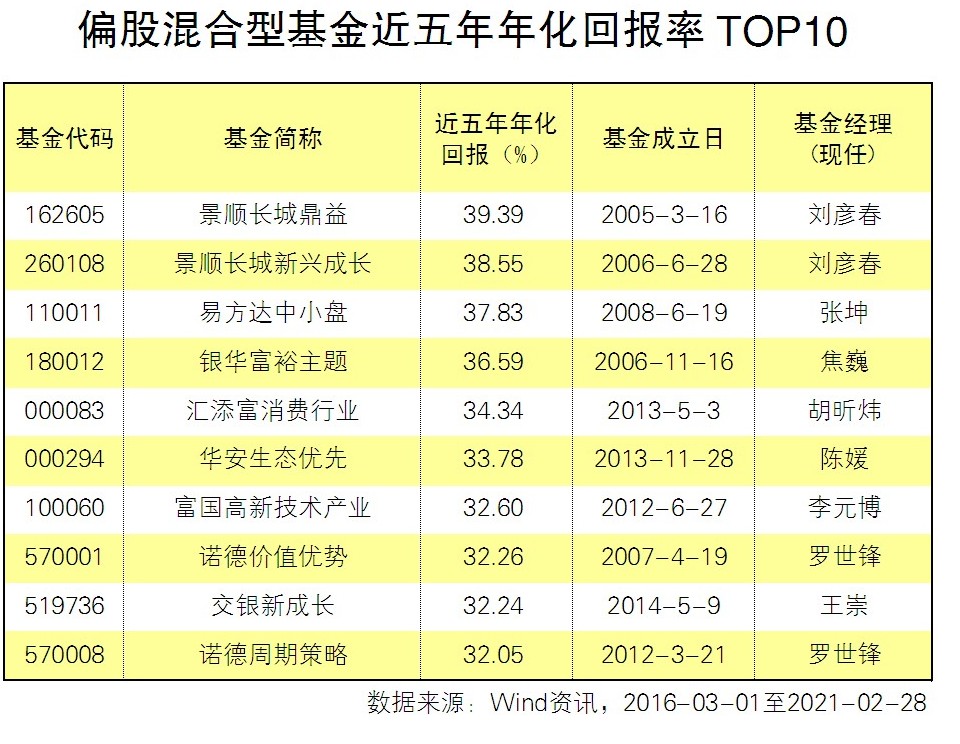偏股混合型基金的整體回報率依舊較普通股票型基金略低,近五年年化回報率平均為18.37%?!洞蟊娮C券報》記者根據Wind數據統計,成立滿五年的482只偏股混合型基金中,排名第一的是劉彥春管理的景順長城鼎益,近五年年化回報率為39.39%,領先于最后一名42個百分點。排名第二的仍是劉彥春管理的景順長城新興成長,近五年年化回報率為38.55%,緊隨其后的是張坤管理的易方達中小盤、焦巍管理的銀華富裕主題、胡昕煒管理的匯添富消費行業,近五年年化回報率均超過34%。