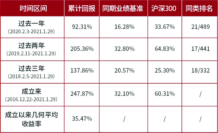 注:基金業績、成立以來幾何平均收益率、同類排名來源:銀河證券;業績基準數據來源:Wind;截至日期:2021.1.29,業績數據已經托管行復核;銀華盛世精選分類:混合基金-靈活配置型基金-靈活配置型基金(股票上下限0-95%+基準股票比例30%-60%)(A類)