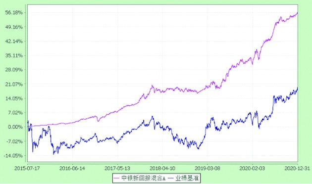(中銀新回報A累計凈值增長率與業績比較基準收益率的歷史走勢對比圖,2015.7.17~2020.12.31,數據來源:基金定期報告)