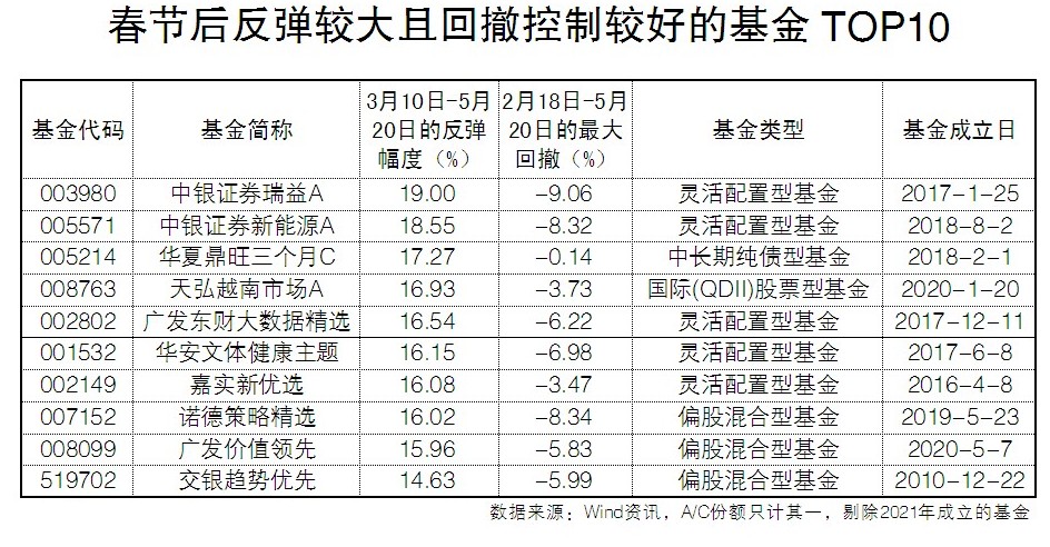 另一方面,記者發現有少數基金,雖然3月10日以來的反彈漲幅不冒尖,但在春節后的調整行情下回撤仍然可控。Wind資訊顯示,中銀證券瑞益、中銀證券新能源3月10日以來反彈幅度超過18%,而春節以來的最大回撤僅有9%左右;廣發東財大數據精選反彈幅度為16.54%,最大回撤6.22%;嘉實新優選反彈了 16.08%,最大回撤3.47%;諾德策略精選3月10日以來的反彈幅度超過16.01%,最大回撤為8.34%。(見表)