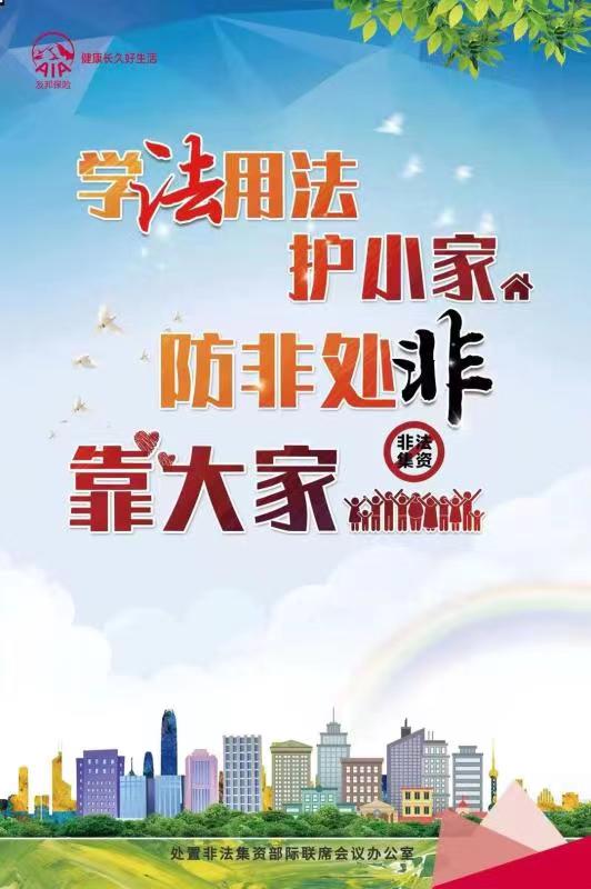 友邦江蘇對本次活動高度重視,成立以分公司總經理為組長、分公司各職能部門負責人和業務區部負責人為組員的工作領導小組。友邦江蘇面向江蘇分公司下轄的全體內外勤以及廣大保險消費者和社會公眾,開展了形式多樣的宣傳活動,通過官方網站、官方微信等自媒體平臺、客服電話自動語音播報、公司APP首頁系統界面、以及向所有有效保單投保人發送短信等方式進行防范非法集資宣傳教育;以友邦江蘇各下轄機構營業網點為依托,采用保險銷售人員早會宣導,職場電子屏滾動播放宣傳視頻短片,在職場張貼海報、擺放展架、發放宣傳資料等多種形式的宣傳方式,擴大活動宣傳覆蓋面,進行《條例》普法宣傳和防范非法集資知識宣傳,為消除社會金融風險隱患、營造和諧穩定的環境創造良好的氛圍。友邦江蘇還通過企業微信號發布《條例》知識宣傳圖,并采用有獎競答活動形式吸引廣大內外勤參與《條例》知識的學習,增加《條例》學習的主動性和趣味性,堅決防止內外勤參與非法集資。