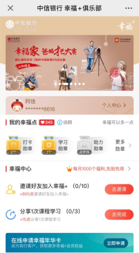 在“中信銀行”微信公眾號搜索“幸福”,點擊進入“幸福+”俱樂部,用手機號碼注冊成為會員即可學習,同時,記者還發現,“幸福+”俱樂部會員通過簽到、學習、打卡、分享,還可以積累“幸福點”,每月幸福點達到一定標準還可以兌換手機話費等權益。