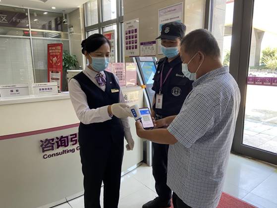 (紫金農商銀行網點做好測溫、驗碼工作)
