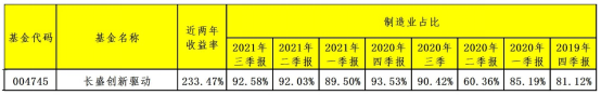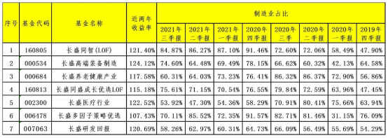 除了長盛創新驅動基金近兩年因重倉制造業收益表現極佳,我們從海通證券數據看到,截至三季度,近2年長盛高端裝備制造、長盛醫療行業、長盛同智(LOF)、長盛研發回報四只產品收益率均超120%,分別為124.12%、122.52%、121.4%和120.69%;另外,長盛養老健康產業、長盛同盛成長優選LOF、長盛多因子策略優選三只基金分別以117.58%、115.18%、107.43%的收益率實現了凈值翻倍。分析這7只產品過往定期報告,我們發現,在過去兩年的八個季度,這些產品至少有7個季度在制造業板塊的持倉占比超過50%,其中長盛養老健康產業和長盛研發回報兩只產品在近兩年的投資運作中制造業持倉占比均保持在50%以上。
