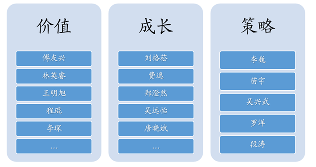 當(dāng)然其中亦有細微區(qū)別,比如何震偏向捕捉優(yōu)質(zhì)成長股,陳仕德偏好小盤股,劉曉龍兼顧爆發(fā)性行業(yè)和策略配置。此外,當(dāng)時也有偏好周期成長的基金經(jīng)理。