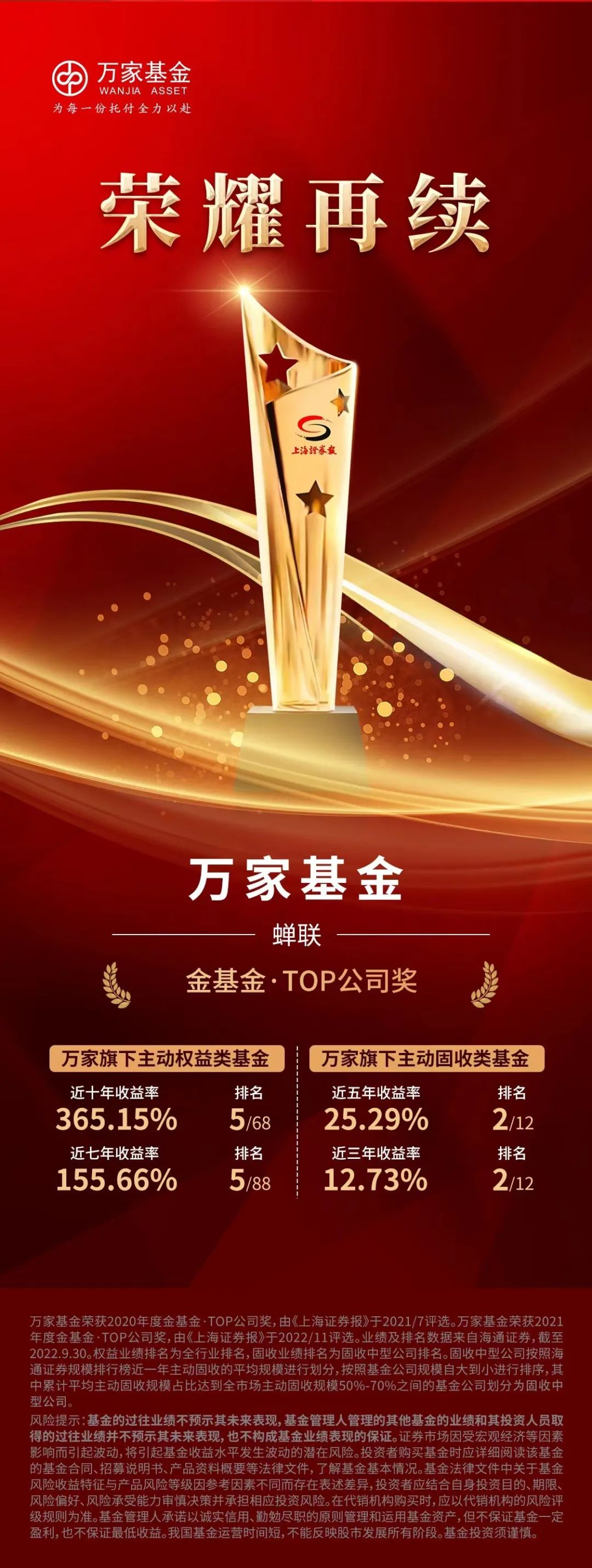 11月14日,由《上海證券報》評選的第十九屆中國基金業(yè)“金基金獎”榜單正式揭曉,憑借強大的綜合實力和優(yōu)異的長期業(yè)績,萬家基金再次捧得該評選至高榮譽——“金基金·TOP公司獎”,這已是萬家基金攬獲的第3座“TOP公司獎”獎杯。