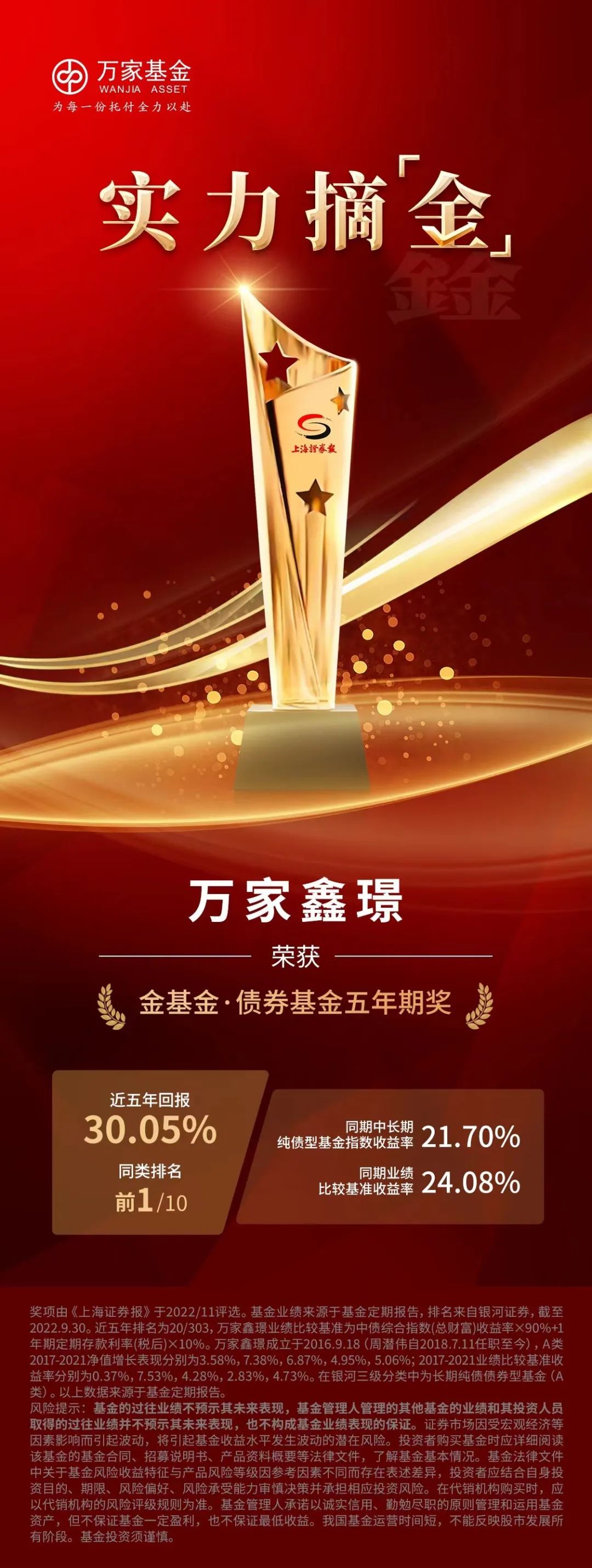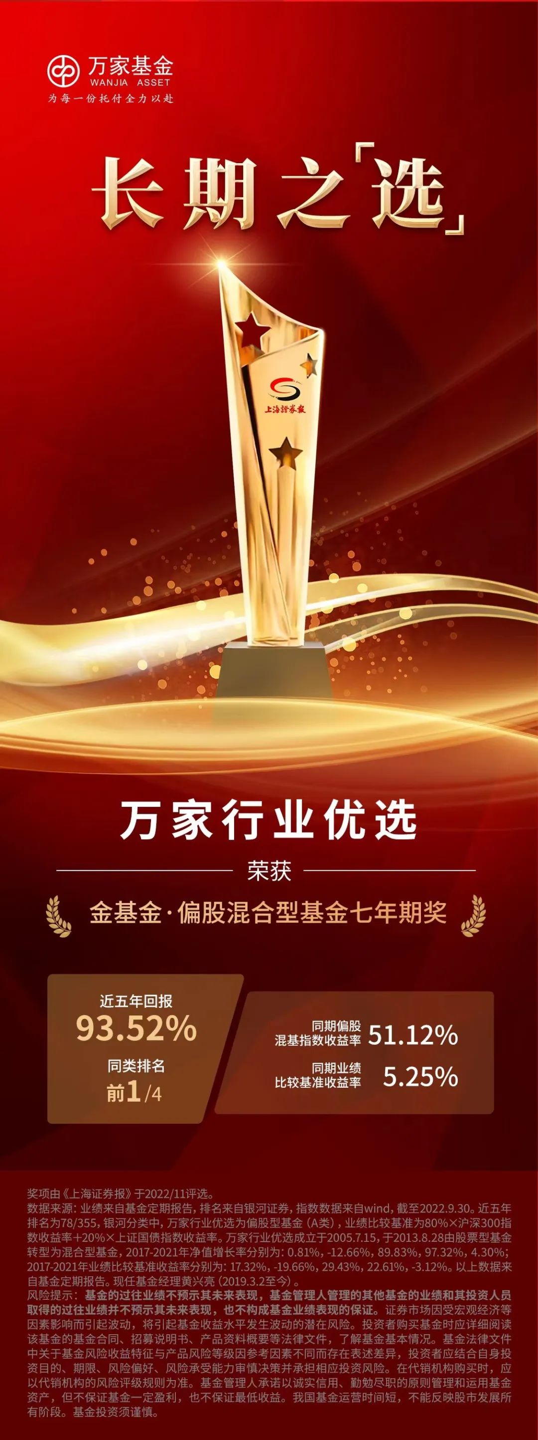 在本次評選中,公司旗下多支產(chǎn)品亦獲殊榮——萬家行業(yè)優(yōu)選榮獲“金基金·偏股混合型基金七年期獎”、萬家鑫璟榮獲“金基金·偏債混合型基金五年期獎”。