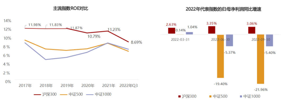 3、當下大盤藍籌性價比凸顯。下圖展示了主流指數(shù)包括滬深300、中證500和中證1000指數(shù)的ROE對比,以及2022年的歸母凈利潤同比增速。很明顯滬深300具有高且穩(wěn)定的盈利能力,今年在國內(nèi)外宏觀環(huán)境較為復(fù)雜的情況下 ,龍頭企業(yè)的抗風險能力更強 ,大盤的盈利增速相對更具優(yōu)勢,配置性價比更高。