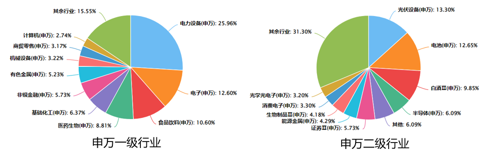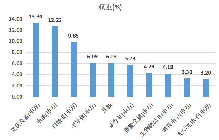 從申萬二級行業(yè)來看,300成長指數(shù)目前涵蓋了40個行業(yè),其中行業(yè)權(quán)重超過3%的統(tǒng)計如下,光伏設(shè)備、電池和白酒三個行業(yè)占比靠前,占比分別為13.30%、12.65%、9.85%。
