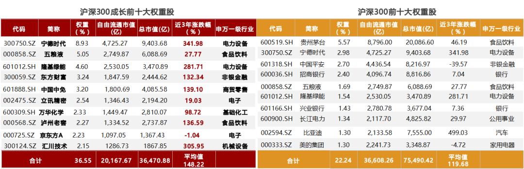 滬深300成長的前十大權(quán)重股和滬深300前十大權(quán)重股的對比見下表,從申萬一級行業(yè)來看,300成長少了“銀行”、“公用事業(yè)”、汽車等,多了電子、商貿(mào)零售、機械設(shè)備等,更偏“成長”。