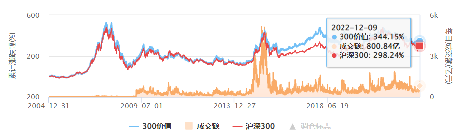 下圖是300成長、300價值、滬深300自基日以來的漲跌幅走勢圖,截至2022年12月9日,300成長漲幅414.65%(年化回報9.71%),同期300價值漲幅344.15%(年化回報8.79%),滬深300指數(shù)漲幅298.24%(年化回報8.27%),很明顯,長期走勢來看,300成長>300價值>滬深300。