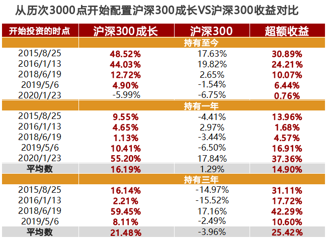 數(shù)據(jù)來源 :Wind ,截至2022.11.30 。 其中2017/2021年未跌破3000點;第六次跌破3000點的時點為 2022/4/25 ,因距今不滿1年因此不納入本次統(tǒng)計范疇。超額收益為滬深300成長指數(shù)超越滬深300指數(shù)的收益。指數(shù)收益不預(yù)示基金未來業(yè)績表現(xiàn) ,也不構(gòu)成對基金未來業(yè)績表現(xiàn)的保證。