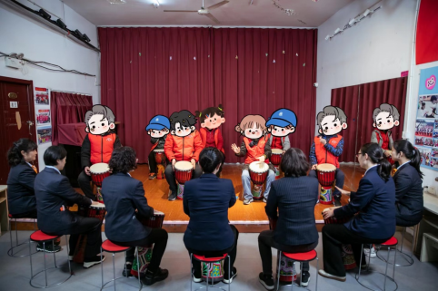 博愛安養(yǎng)中心這群特殊的孩子們大多患有智力障礙、自閉癥、腦癱等疾病,雖然身體看起來與常人無異,但心智卻僅有5-6歲。對于他們來說,比起物質(zhì)的幫助,孩子們更加渴望陪伴與有愛的互動(dòng)?;顒?dòng)現(xiàn)場藍(lán)精靈志愿者們變身陪伴天使,打鼓、唱歌、做手工,只要孩子們喜歡,他們便現(xiàn)學(xué)現(xiàn)做,只為讓孩子們開心玩耍。“咚、噠、咚咚噠……”一曲悅耳的鼓聲合奏在活動(dòng)現(xiàn)場悠然響起。在老師的耐心指導(dǎo)下,藍(lán)精靈志愿者們與孩子們面對面而坐,互相配合打起非洲鼓,用眼神傳遞著溫暖與鼓勵(lì),共同演繹了一曲完整的《早安隆回》。隨后,志愿者們一同走上臺(tái),與孩子們一起表演《感恩的心》手語操,現(xiàn)場的氣氛被推上高潮,看似簡單的動(dòng)作卻是長年累月的學(xué)習(xí)訓(xùn)練成果,看到孩子們的精彩表演,志愿者們也由衷的為他們感到開心與欣慰,紛紛熱烈鼓掌,為他們豎起了大拇指!