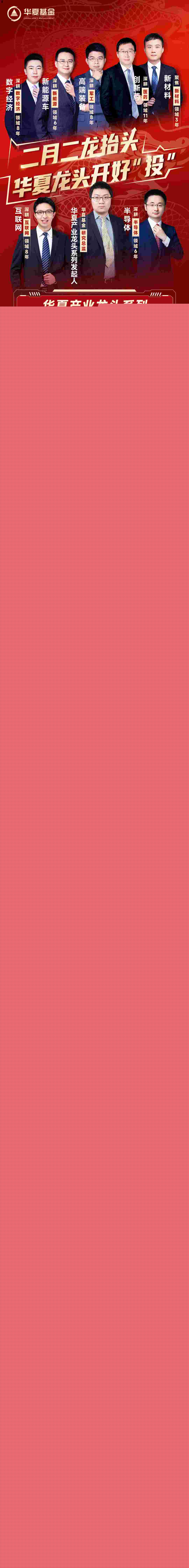 2月21日,在農(nóng)歷“龍?zhí)ь^”這一特殊日子,華夏基金舉行專場直播,旗下多只產(chǎn)業(yè)龍頭系列基金經(jīng)理在線對數(shù)字經(jīng)濟、互聯(lián)網(wǎng)、高端制造、創(chuàng)新醫(yī)藥、新能源車等市場關(guān)注的熱門行業(yè)投資機遇進行全面解析,并深度闡釋龍頭股投資策略在這些行業(yè)中的應(yīng)用,也正式揭曉華夏產(chǎn)業(yè)龍頭系列產(chǎn)品設(shè)立背后的故事。