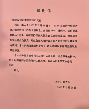 近日,建設銀行南京新街口支行收到一份感謝信。