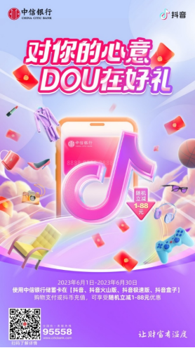 “6·18”作為年度消費盛宴的重要節日,抖音、京東等各大電商均在積極行動,加大優惠力度。中信銀行借記卡以“6·18促消費”為抓手,充分發揮借記卡產品在電商消費支付環節的作用,推出系列支付優惠活動,讓用戶在開心消費的同時買得更便宜,享受真實惠。