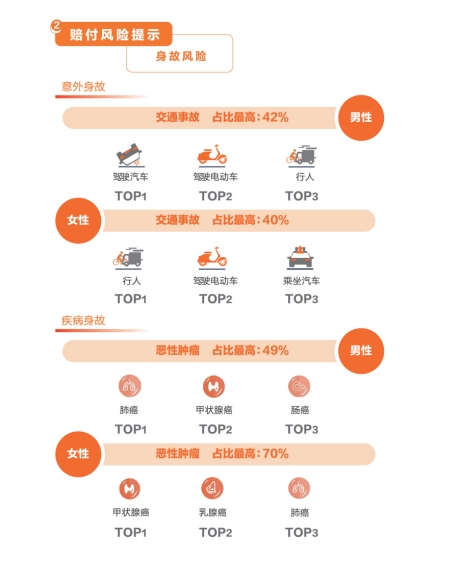 數據顯示,成年前,男性風險高于女性;成年后,女性風險略高于男性。從理賠原因看,男性主要是身故風險,女性主要是重大疾病。