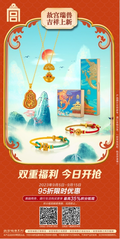據(jù)悉,“故宮瑞獸”第5季系列新品已于2023年9月5日在建行全國各網(wǎng)點發(fā)售,9月5日至9月15日期間購買,限時可享9.5折優(yōu)惠,還有更多福利放送。