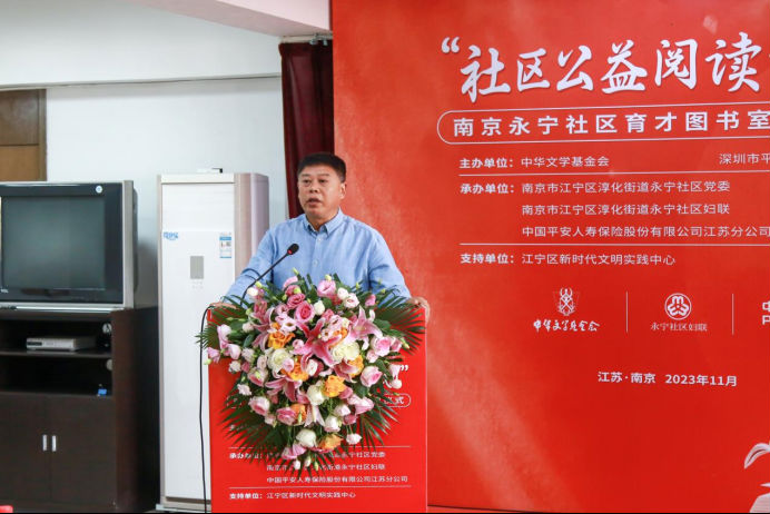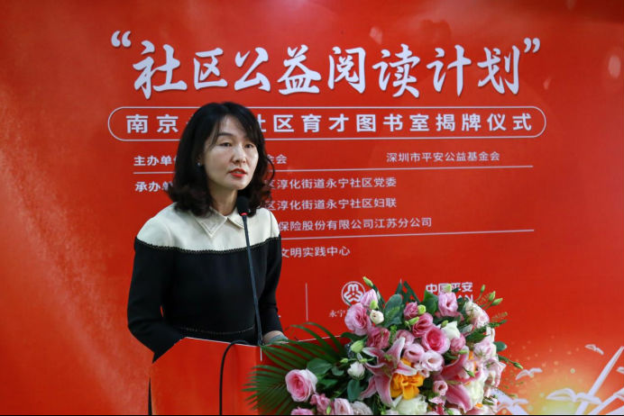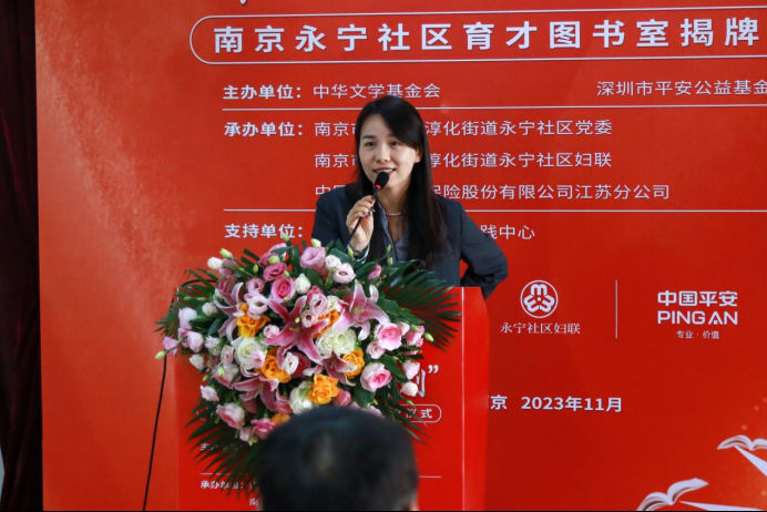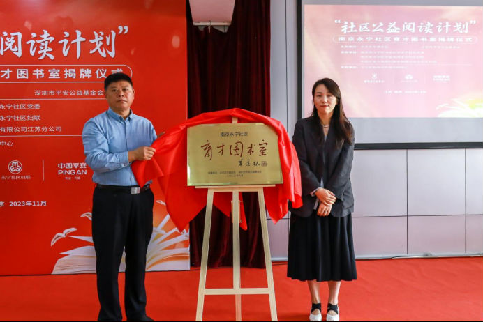 永寧社區(qū)黨委書(shū)記周彩培和作家朱婧女士,一同為永寧社區(qū)育才圖書(shū)室揭牌;中國(guó)平安江蘇地區(qū)品牌總監(jiān)徐嘉懌向永寧社區(qū)贈(zèng)書(shū)。
