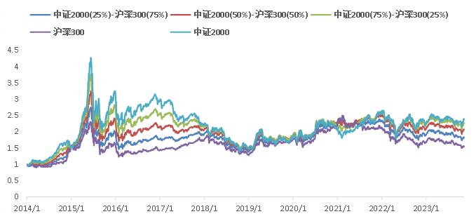 滬深300分別與中證1000、中證2000的組合配置凈值走勢(2014.1.1—2023.11.12)