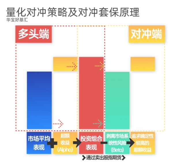 產品是否適合,首先從投資者的風險偏好和配置需求開始考慮。量化對沖的投資策略是一類特殊的絕對收益策略,它跟傳統的債券組合為主的絕對收益策略不同,而是由“股票多頭端”和“對沖空頭端”兩部分構成,就是在買入股票現貨的同時,賣出相應的股指期貨合約。通過賣出股指期貨,將現貨部分的系統性風險(Beta)剝離,因此整體組合基本不受市場大幅波動的影響,在一定程度上構建了一個“市場中性”組合。